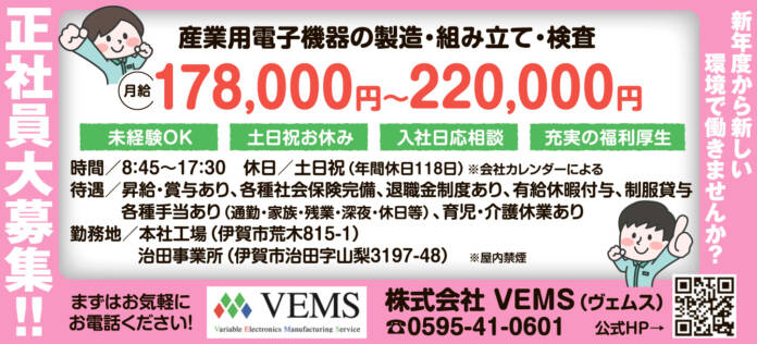 ホーム 求人情報 株式会社VEMS(ヴェムス) 求人情報正社員名張 株式会社VEMS(ヴェムス) 2026年3月13日 32 LINETwitterFacebookPinterest 雇用形態正社員 応募方法まずは、お気軽にお電話ください。 応募・問合せ先0595-41-0601 - 広告 - 同じカテゴリーの記事 求人情報 ABホテル株式会社 求人情報 株式会社 松本園 求人情報 社会福祉法人 こもはら福祉会 はなの里 求人情報All正社員契約社員派遣パートアルバイトその他伊賀名張その他の地域もっと NOVA伊賀上野アピタ校 2026年2月27日 名阪チサンカントリークラブ 2026年2月27日 社会医療法人 畿内会 岡波総合病院 2026年2月27日 社会福祉法人 伊賀昴会 2026年2月27日 ニュースAll総合事件・事故議会・行政紙面もっと 紙面 伊賀FCくノ一三重、5年ぶり優勝へ 22日にホーム開幕戦 総合 高校1年生が「模擬市長選」体験 候補者の演説聞き投票 名張 総合 ガソリン大幅値上げ レギュラー190円台も 伊賀地域のスタンド 総合 伝統の松明調進 今年も列車で名張から奈良・東大寺へ