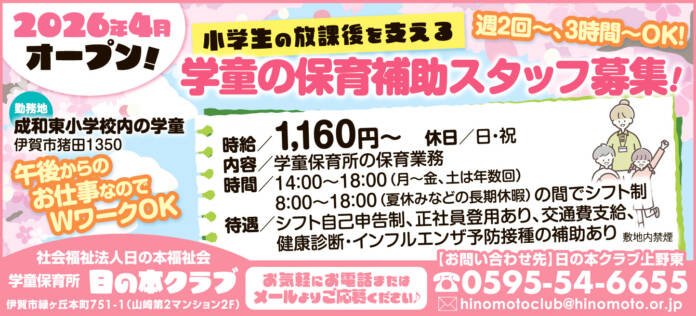ホーム 求人情報 社会福祉法人日の本福祉会 学童保育所 日の本クラブ 求人情報パート伊賀 社会福祉法人日の本福祉会 学童保育所 日の本クラブ 2026年3月13日 39 LINETwitterFacebookPinterest 紙面広告はこちらをクリック 雇用形態パート 応募方法お電話またはメールよりご応募ください 応募・問合せ先☏0595-54-6655✉hinomotoclub@hinomoto.or.jp - 広告 - 同じカテゴリーの記事 求人情報 ABホテル株式会社 求人情報 株式会社 松本園 求人情報 社会福祉法人 こもはら福祉会 はなの里 求人情報All正社員契約社員派遣パートアルバイトその他伊賀名張その他の地域もっと 日化メンテナンス株式会社 2026年2月27日 株式会社 松本園 2026年3月13日 社会福祉法人 伊賀昴会 2026年2月27日 株式会社ホットスタッフ伊賀 2026年2月27日 ニュースAll総合事件・事故議会・行政紙面もっと 紙面 伊賀FCくノ一三重、5年ぶり優勝へ 22日にホーム開幕戦 総合 高校1年生が「模擬市長選」体験 候補者の演説聞き投票 名張 総合 ガソリン大幅値上げ レギュラー190円台も 伊賀地域のスタンド 総合 伝統の松明調進 今年も列車で名張から奈良・東大寺へ