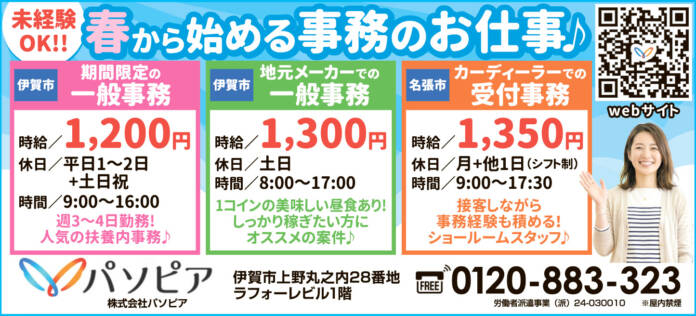 ホーム 求人情報 株式会社パソピア 求人情報派遣伊賀名張 株式会社パソピア 2026年3月13日 26 LINETwitterFacebookPinterest 紙面広告はこちらをクリック 雇用形態派遣 応募方法0120-883-323 応募・問合せ先まずは、お気軽にお電話ください。 - 広告 - 同じカテゴリーの記事 求人情報 ABホテル株式会社 求人情報 株式会社 松本園 求人情報 社会福祉法人 こもはら福祉会 はなの里 求人情報All正社員契約社員派遣パートアルバイトその他伊賀名張その他の地域もっと プリマハム株式会社 三重工場 2026年3月13日 株式会社 キタモリ 2026年3月13日 社会福祉法人創生会 グッドタイムクラブやぶっちゃ 2026年3月13日 日化メンテナンス株式会社 2026年2月27日 ニュースAll総合事件・事故議会・行政紙面もっと 紙面 伊賀FCくノ一三重、5年ぶり優勝へ 22日にホーム開幕戦 総合 高校1年生が「模擬市長選」体験 候補者の演説聞き投票 名張 総合 ガソリン大幅値上げ レギュラー190円台も 伊賀地域のスタンド 総合 伝統の松明調進 今年も列車で名張から奈良・東大寺へ