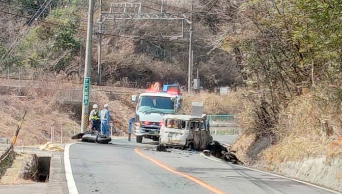 市消防本部と伊賀署によると、現場は伊賀鉄道比土駅の南東約600メートル。国道は片側1車線で、現場付近はカーブになっている。火災は道路脇の山林にも一部広がったが、発生から約35分後に鎮火した。
