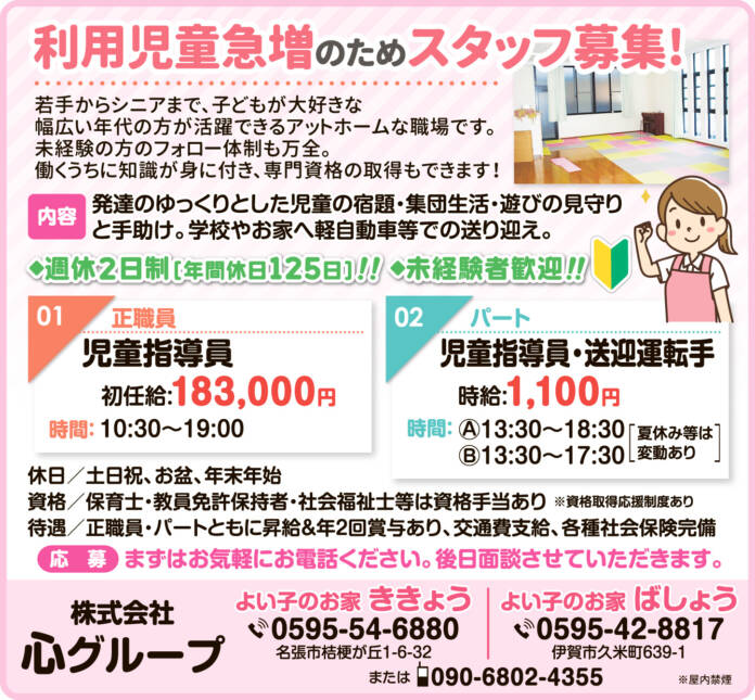 ホーム 求人情報 株式会社心グループ よい子のお家 求人情報正社員パート伊賀名張 株式会社心グループ よい子のお家 2026年3月27日 53 LINETwitterFacebookPinterest 紙面広告はこちらをクリック 雇用形態正職員・パート 応募方法まずはお気軽にお電話ください。後日面談させていただきます。 応募・問合せ先ききょう/0595-54-6880ばしょう/0595-42-8817担当直通/090-6802-4355 - 広告 - 同じカテゴリーの記事 求人情報 株式会社橋本 求人情報 ダイジェット工業株式会社 求人情報 ABホテル株式会社 求人情報All正社員契約社員派遣パートアルバイトその他伊賀名張その他の地域もっと 株式会社ホットスタッフ伊賀 2026年3月27日 ABホテル株式会社 2026年3月27日 株式会社 松本園 2026年3月13日 社会医療法人 畿内会 岡波総合病院 2026年3月27日 ニュースAll総合事件・事故議会・行政紙面もっと 紙面 書にも歌にも気持ち込め 藤田さん書作展 28日から伊賀で 総合 国登録有形文化財へ 名張市の旧高北家住宅と長慶寺 文化審議会 議会・行政 市長給与削減案を可決 阿山運動公園の人工芝化予算を削除 伊賀市議会 総合 国登録有形文化財に答申 伊賀焼の旧協同組合事務所 文化審議会
