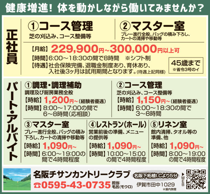ホーム 求人情報 名阪チサンカントリークラブ 求人情報正社員パート伊賀 名阪チサンカントリークラブ 2026年3月27日 41 LINETwitterFacebookPinterest 紙面広告はこちらをクリック 雇用形態正社員・パート 応募方法まずはお気軽にお電話ください 応募・問合せ先0595-43-0735 担当:毛呂(モウロ) - 広告 - 同じカテゴリーの記事 求人情報 株式会社橋本 求人情報 ダイジェット工業株式会社 求人情報 株式会社心グループ よい子のお家 求人情報All正社員契約社員派遣パートアルバイトその他伊賀名張その他の地域もっと ダイジェット工業株式会社 2026年3月27日 ABホテル株式会社 2026年3月13日 武田産婦人科 2026年3月27日 プリマハム株式会社 三重工場 2026年3月13日 ニュースAll総合事件・事故議会・行政紙面もっと 紙面 書にも歌にも気持ち込め 藤田さん書作展 28日から伊賀で 総合 国登録有形文化財へ 名張市の旧高北家住宅と長慶寺 文化審議会 議会・行政 市長給与削減案を可決 阿山運動公園の人工芝化予算を削除 伊賀市議会 総合 国登録有形文化財に答申 伊賀焼の旧協同組合事務所 文化審議会
