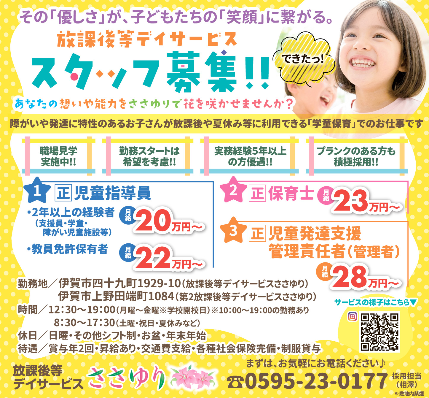 ホーム 求人情報 放課後等デイサービスささゆり 求人情報正社員伊賀 放課後等デイサービスささゆり 2026年3月27日 45 LINETwitterFacebookPinterest 紙面広告はこちらをクリック 雇用形態正職員 応募・問合せ先0595-23-0177(採用担当:相澤) 応募方法まずは、お気軽にお電話ください♪ - 広告 - 同じカテゴリーの記事 求人情報 株式会社橋本 求人情報 ダイジェット工業株式会社 求人情報 株式会社心グループ よい子のお家 求人情報All正社員契約社員派遣パートアルバイトその他伊賀名張その他の地域もっと 株式会社ホットスタッフ伊賀 2026年3月13日 株式会社VEMS(ヴェムス) 2026年3月13日 社会福祉法人 こもはら福祉会 はなの里 2026年3月13日 株式会社心グループ よい子のお家 2026年3月27日 ニュースAll総合事件・事故議会・行政紙面もっと 紙面 書にも歌にも気持ち込め 藤田さん書作展 28日から伊賀で 総合 国登録有形文化財へ 名張市の旧高北家住宅と長慶寺 文化審議会 議会・行政 市長給与削減案を可決 阿山運動公園の人工芝化予算を削除 伊賀市議会 総合 国登録有形文化財に答申 伊賀焼の旧協同組合事務所 文化審議会