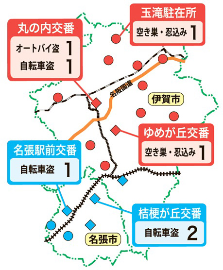 伊賀署管内では、空き巣・忍込みなど侵入盗の被害が2件(ゆめが丘、玉滝各1)、自動車関連ではオートバイ盗が1件(丸の内)あった。