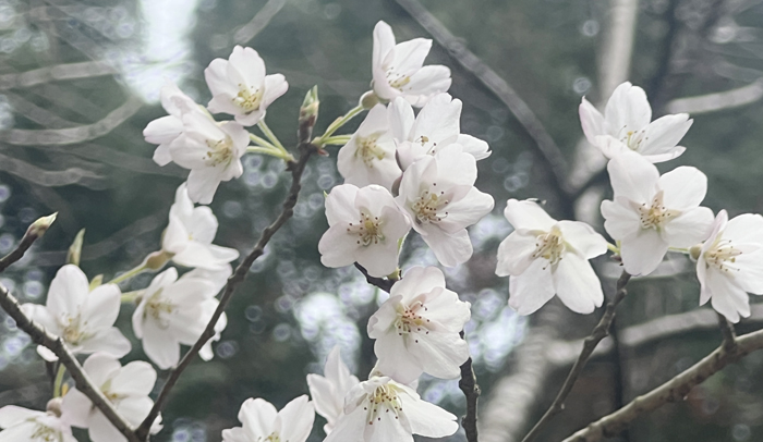 つぼみはピンク色で、満開時には白く、散り際には淡い墨色を帯びるのが特徴。今年は3月28日ごろに開花し、30日現在で満開となった。金山修宮司(69)によると、開花から散り始めまでは、条件が良ければ2週間ほどという。