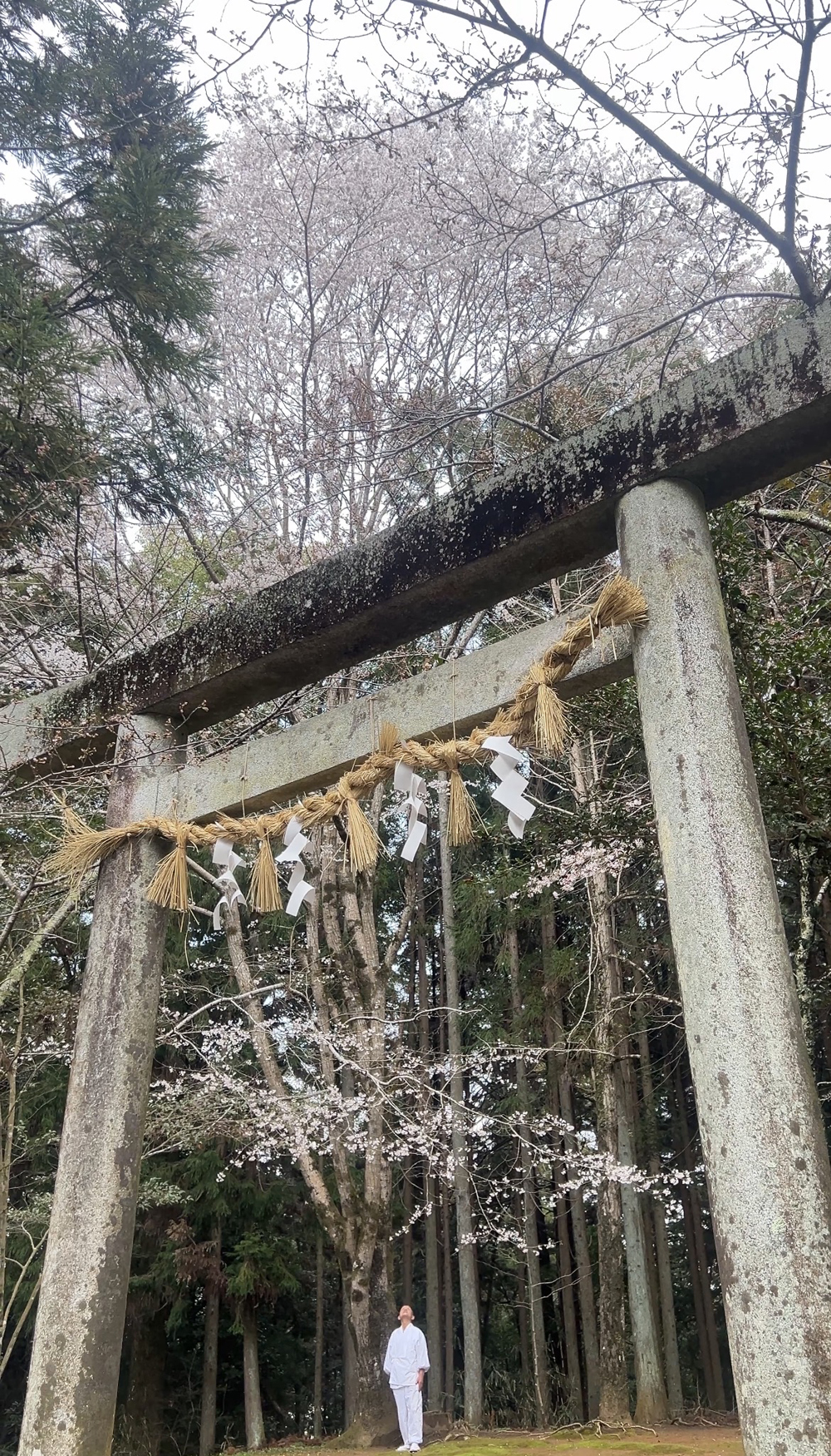 【鳥居の近くに立つ淡墨桜=伊賀市阿保で】