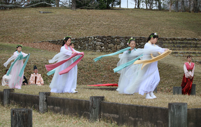 近くの国史跡・夏見廃寺跡では「ひめみこ春まつり」(隠 夏見ひめぼたるプロジェクト主催)が開かれ、創作舞「ひめみこの舞」が初披露された。天女をイメージした華やかな衣装を身に着けた小中高校生らが演じ、観客は見入っていた。