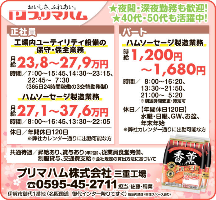 ホーム 求人情報 プリマハム株式会社 三重工場 求人情報正社員パート伊賀 プリマハム株式会社 三重工場 2026年4月10日 37 LINETwitterFacebookPinterest 紙面広告はこちらをクリック 雇用形態パート・正社員 応募方法お気軽にお電話ください 応募・問合せ先0595-45-2711 - 広告 - 同じカテゴリーの記事 求人情報 社会福祉法人 名張育成会 求人情報 株式会社 大栄工業 求人情報 藤澤建機株式会社 求人情報All正社員契約社員派遣パートアルバイトその他伊賀名張その他の地域もっと 社会医療法人 畿内会 岡波総合病院 2026年3月27日 名阪チサンカントリークラブ 2026年3月27日 株式会社 大栄工業 2026年4月10日 株式会社クリンアース・ジャパン 2026年4月10日 ニュースAll総合事件・事故議会・行政紙面もっと 紙面 「記憶の稜線を歩く」現代美術作家・藤原康博さん個展 10日から伊賀で 紙面 名張警察署だより 年度初めのあいさつ 紙面 高校野球春季県大会11日開幕 伊賀から2校出場 3球場で開催 事件・事故 自動車販売店に侵入しタイヤ9本窃盗疑い 男2人逮捕 名張署