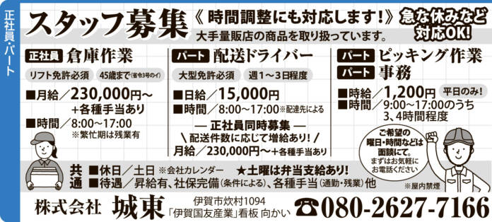 ホーム 求人情報 株式会社城東 求人情報正社員パート伊賀 株式会社城東 2026年4月10日 31 LINETwitterFacebookPinterest 紙面広告はこちらをクリック 雇用形態正社員・パート 応募方法まずはお気軽にお電話ください 応募・問合せ先080-2627-7166 - 広告 - 同じカテゴリーの記事 求人情報 社会福祉法人 名張育成会 求人情報 株式会社 大栄工業 求人情報 藤澤建機株式会社 求人情報All正社員契約社員派遣パートアルバイトその他伊賀名張その他の地域もっと 一般財団法人 信貴山病院分院 上野病院 2026年3月27日 ABホテル株式会社 2026年4月10日 名阪チサンカントリークラブ 2026年3月27日 株式会社橋本 2026年3月27日 ニュースAll総合事件・事故議会・行政紙面もっと 紙面 「記憶の稜線を歩く」現代美術作家・藤原康博さん個展 10日から伊賀で 紙面 名張警察署だより 年度初めのあいさつ 紙面 高校野球春季県大会11日開幕 伊賀から2校出場 3球場で開催 事件・事故 自動車販売店に侵入しタイヤ9本窃盗疑い 男2人逮捕 名張署