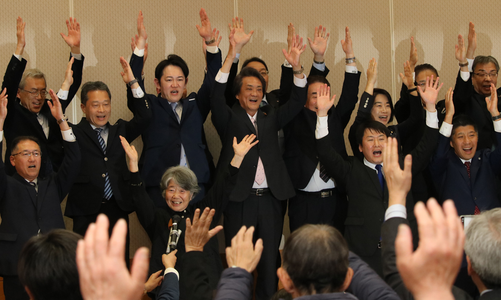 【再選を決め、万歳する北川氏(中央)ら=名張市南町で】