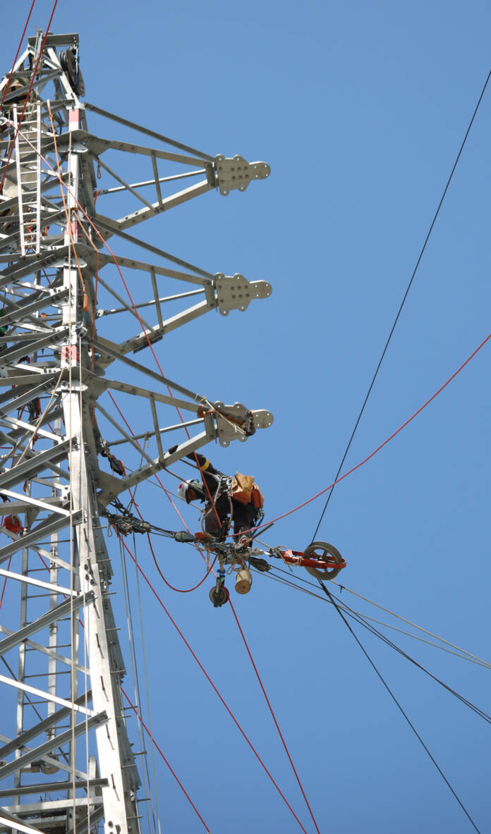 作業員は墜落制止用器具のフルハーネス型安全帯を着用し、鉄塔上の限られた足場でロープを手繰り寄せるなどの高所作業を行った。移設はロープ、ワイヤー、電線の順に引き込む工程で実施。地上と上空の作業員が連携し、滑車なども使いながら慎重に進めた。