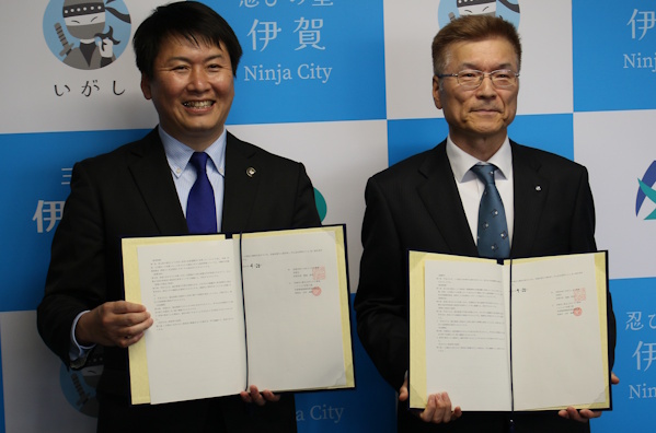 【協定書を手にする吉村理事長(右)と稲森市長=伊賀市役所で】