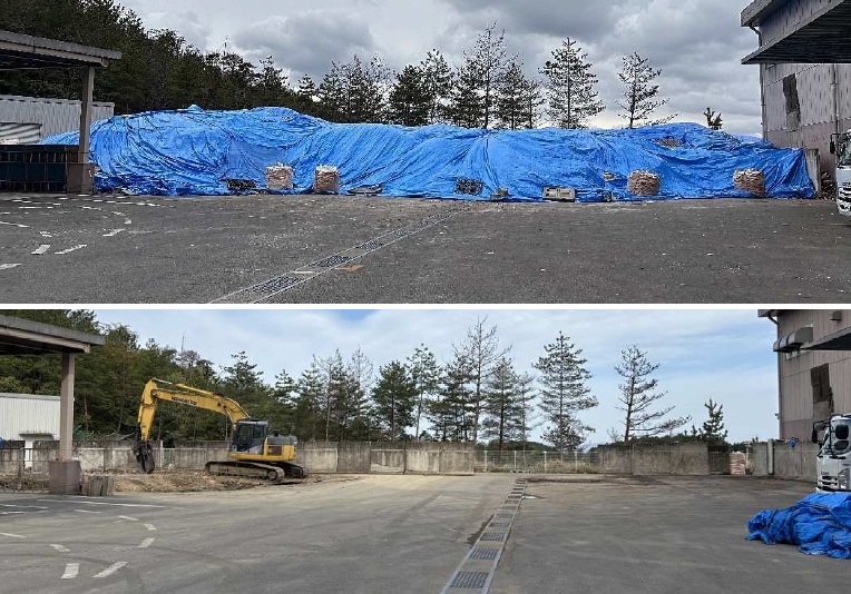 【(上写真=3月13日撮影)仮置きされた約650トンの可燃ごみ、(下写真=4月19日撮影)仮置き解消後の様子(いずれも伊賀南部環境衛生組合提供)】