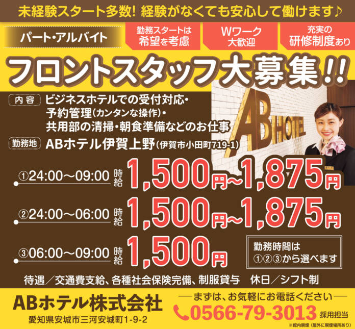 ホーム 求人情報 ABホテル株式会社 求人情報パートアルバイト伊賀 ABホテル株式会社 2026年4月24日 41 LINETwitterFacebookPinterest 紙面広告はこちらをクリック 雇用形態パート・アルバイト 応募方法まずは、お気軽にお電話ください。 応募・問合せ先ABホテル株式会社(愛知県安城市三河安城町1-9-2)0566-79-3013【採用担当】 - 広告 - 同じカテゴリーの記事 求人情報 ロート製薬株式会社 求人情報 パナソニック ライティングシステムズ株式会社 求人情報 日合通信電線株式会社 求人情報All正社員契約社員派遣パートアルバイトその他伊賀名張もっと 社会福祉法人 こもはら福祉会 はなの里 2026年4月10日 社会福祉法人 名張育成会 2026年4月10日 リハビリデイサービスささゆり 2026年4月24日 阿山カンツリー俱楽部 2026年4月24日 ニュースAll総合事件・事故議会・行政紙面もっと 紙面 園児11人の日常を絵本に 保護者ら思い込め制作 伊賀 紙面 青空に心地良く泳ぐこいのぼり YOU通じ譲渡 伊賀・上野森林公園 事件・事故 麻薬取締法違反 大麻を共同所持した疑いで夫婦逮捕 伊賀署 紙面 久留米絣の作品展 25、26日 名張のTACHI・花