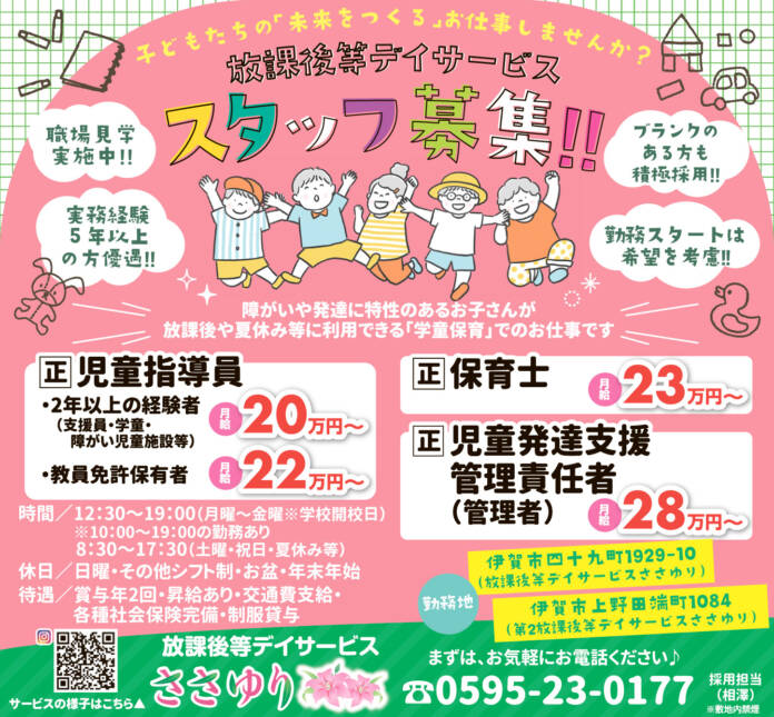 ホーム 求人情報 放課後等デイサービスささゆり 求人情報正社員 放課後等デイサービスささゆり 2026年4月24日 37 LINETwitterFacebookPinterest 紙面広告はこちらをクック 雇用形態正職員 応募・問合せ先0595-23-0177(担当:相澤) 応募方法まずは、お気軽にお電話ください♪ - 広告 - 同じカテゴリーの記事 求人情報 ロート製薬株式会社 求人情報 パナソニック ライティングシステムズ株式会社 求人情報 日合通信電線株式会社 求人情報All正社員契約社員派遣パートアルバイトその他伊賀名張もっと 信岡医院 2026年4月24日 社会医療法人 畿内会 岡波総合病院 2026年4月24日 社会福祉法人 こもはら福祉会 はなの里 2026年4月10日 伊賀接骨院 2026年4月24日 ニュースAll総合事件・事故議会・行政紙面もっと 紙面 園児11人の日常を絵本に 保護者ら思い込め制作 伊賀 紙面 青空に心地良く泳ぐこいのぼり YOU通じ譲渡 伊賀・上野森林公園 事件・事故 麻薬取締法違反 大麻を共同所持した疑いで夫婦逮捕 伊賀署 紙面 久留米絣の作品展 25、26日 名張のTACHI・花