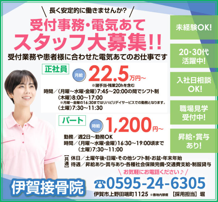 ホーム 求人情報 伊賀接骨院 求人情報正社員パート 伊賀接骨院 2026年4月24日 39 LINETwitterFacebookPinterest 紙面広告はこちらをクック 雇用形態正社員・パート 応募・問合せ先0595-24-6305(担当:堀) 応募方法まずは、お気軽にお電話ください♪ - 広告 - 同じカテゴリーの記事 求人情報 ロート製薬株式会社 求人情報 パナソニック ライティングシステムズ株式会社 求人情報 日合通信電線株式会社 求人情報All正社員契約社員派遣パートアルバイトその他伊賀名張もっと 株式会社 大栄工業 2026年4月10日 株式会社ホットスタッフ伊賀 2026年4月24日 藤澤建機株式会社 2026年4月10日 阿山カンツリー俱楽部 2026年4月24日 ニュースAll総合事件・事故議会・行政紙面もっと 紙面 園児11人の日常を絵本に 保護者ら思い込め制作 伊賀 紙面 青空に心地良く泳ぐこいのぼり YOU通じ譲渡 伊賀・上野森林公園 事件・事故 麻薬取締法違反 大麻を共同所持した疑いで夫婦逮捕 伊賀署 紙面 久留米絣の作品展 25、26日 名張のTACHI・花