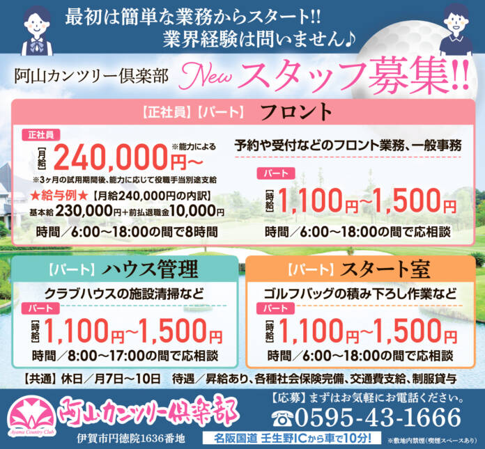 ホーム 求人情報 阿山カンツリー俱楽部 求人情報正社員パート伊賀 阿山カンツリー俱楽部 2026年4月24日 34 LINETwitterFacebookPinterest 紙面広告はこちらをクリック 雇用形態正社員・パート 応募方法まずは、お気軽にお電話ください。 応募・問合せ先0595-43-1666 - 広告 - 同じカテゴリーの記事 求人情報 ロート製薬株式会社 求人情報 パナソニック ライティングシステムズ株式会社 求人情報 日合通信電線株式会社 求人情報All正社員契約社員派遣パートアルバイトその他伊賀名張もっと 放課後等デイサービスささゆり 2026年4月24日 名阪チサンカントリークラブ 2026年4月24日 ロート製薬株式会社 2026年4月24日 信岡医院 2026年4月24日 ニュースAll総合事件・事故議会・行政紙面もっと 紙面 園児11人の日常を絵本に 保護者ら思い込め制作 伊賀 紙面 青空に心地良く泳ぐこいのぼり YOU通じ譲渡 伊賀・上野森林公園 事件・事故 麻薬取締法違反 大麻を共同所持した疑いで夫婦逮捕 伊賀署 紙面 久留米絣の作品展 25、26日 名張のTACHI・花