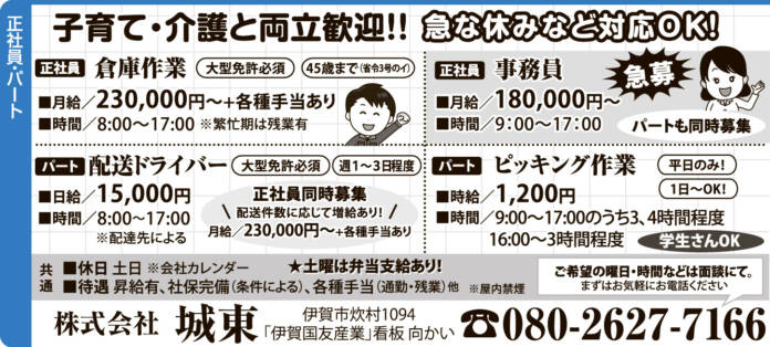 ホーム 求人情報 株式会社城東 求人情報正社員パート伊賀 株式会社城東 2026年4月24日 25 LINETwitterFacebookPinterest 紙面広告はこちらをクリック 雇用形態正社員・パート 応募方法まずはお気軽にお電話ください 応募・問合せ先080-2627-7166 - 広告 - 同じカテゴリーの記事 求人情報 ロート製薬株式会社 求人情報 パナソニック ライティングシステムズ株式会社 求人情報 日合通信電線株式会社 求人情報All正社員契約社員派遣パートアルバイトその他伊賀名張もっと プリマハム株式会社 三重工場 2026年4月10日 ロート製薬株式会社 2026年4月24日 リハビリデイサービスささゆり 2026年4月24日 社会福祉法人 名張育成会 2026年4月10日 ニュースAll総合事件・事故議会・行政紙面もっと 紙面 園児11人の日常を絵本に 保護者ら思い込め制作 伊賀 紙面 青空に心地良く泳ぐこいのぼり YOU通じ譲渡 伊賀・上野森林公園 事件・事故 麻薬取締法違反 大麻を共同所持した疑いで夫婦逮捕 伊賀署 紙面 久留米絣の作品展 25、26日 名張のTACHI・花