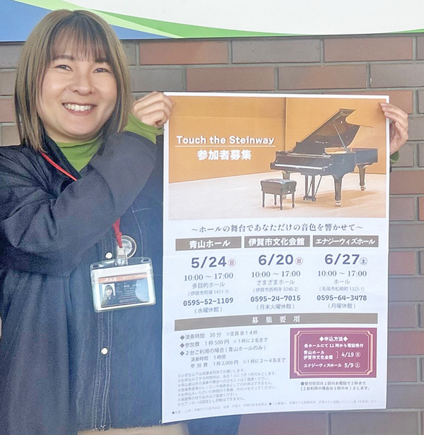 同協会の担当者は「年齢制限なし、レベル、地域も関係なし。なかなか触れる機会のないスタインウェイを弾いてみませんか。エナジーウィズホールでは初開催なので名張の方もぜひ」と参加を呼び掛けている。