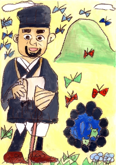 谷森さんは「芭蕉さんが『かえる』『ちょう』を見て、はいくを考えているところをかきました。季節は夏です。時こくは、夕方です。わたしは芭蕉さんの『古池や かわずとびこむ 水の音』のはいくが好きです。理由はリズム感が良いからです。わたしも、いつかリズム感の良いはいくを作れたら良いなあと思います」と作品への思いを話した。