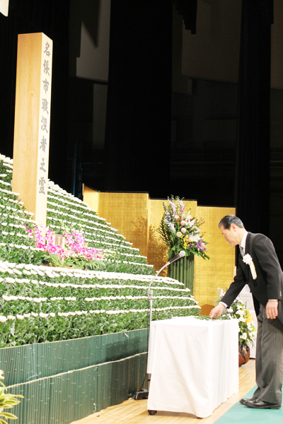 式では参列者が黙とうし、壇上に設けられた献花台に白い菊を手向け、戦没者を悼んだ。