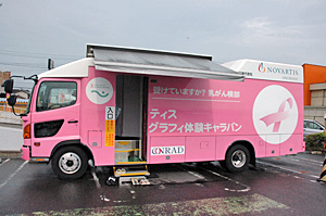 マンモグラフィ搭載バスで全国を巡回し、乳がんの啓発活動をしている「ノバルティスマンモグラフィ体験キャラバン」が、このほど津市高茶屋のイオン津南ショッピングセンターを訪れた。同キャラバン隊が三重県を訪れるのは初めてで、抽選による女性30人のマンモグラフィ体験やパネル展示などで、買い物客らに乳がんの早期発見や定期検診の重要性を訴えていた。