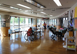 家庭(あるいは施設)で生活されている障害者の方に対して、自立性の向上と社会参加の促進のため、介護(入浴、給食、送迎など)、リハビリテーション、日常生活訓練、創作活動を通して生きがいのある生活への援助をします。